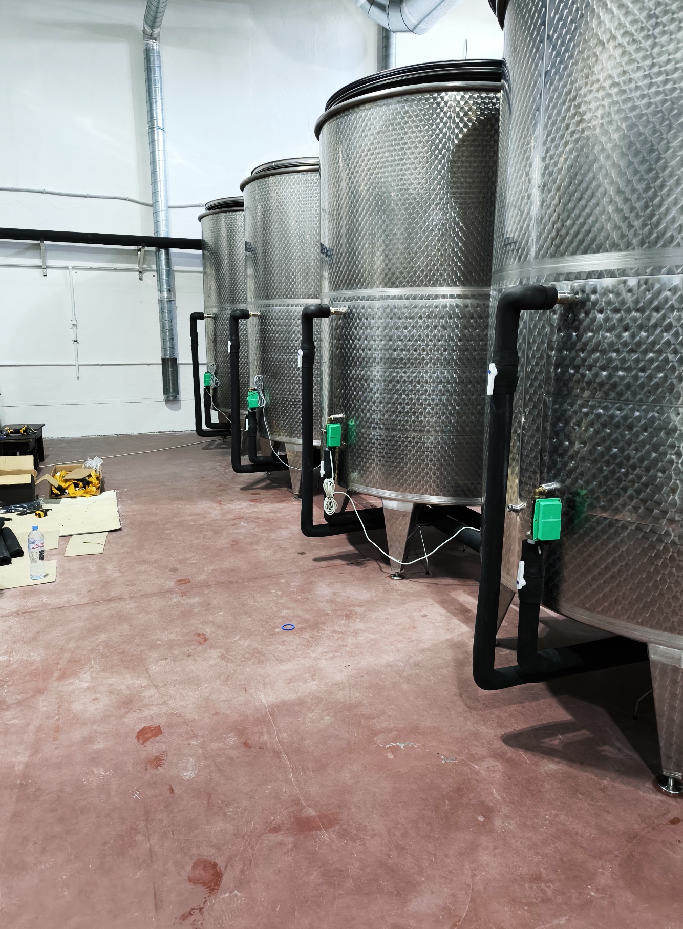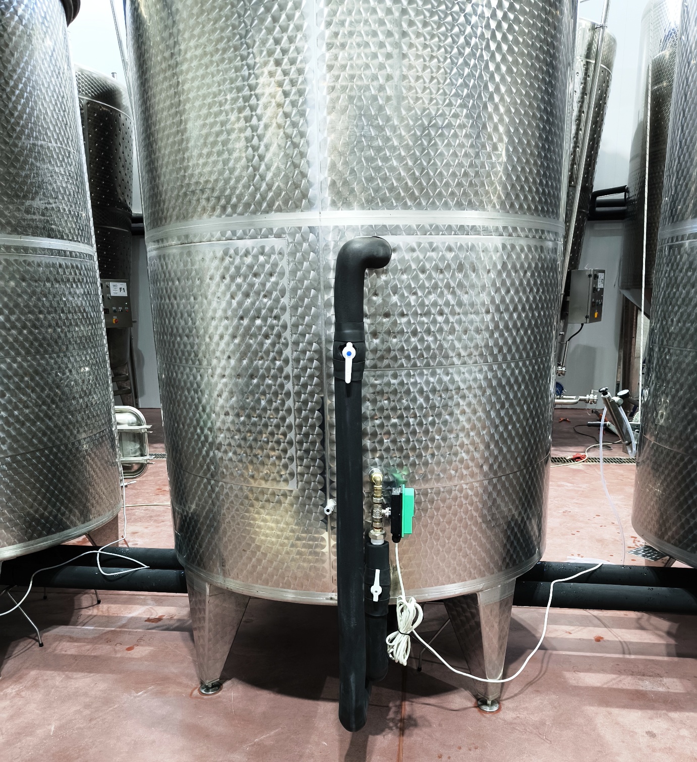 Автоматизированная насосная станция с частотным регулированием поддерживает стабильное давление в трубопроводе подачи. Кроме того часть из емкостей оборудована редукторами с целью дополнительной безопасности. Выполнена балансировка каждой ветки групп емкостей и винификаторов по расходу хладоносителя и давлению.