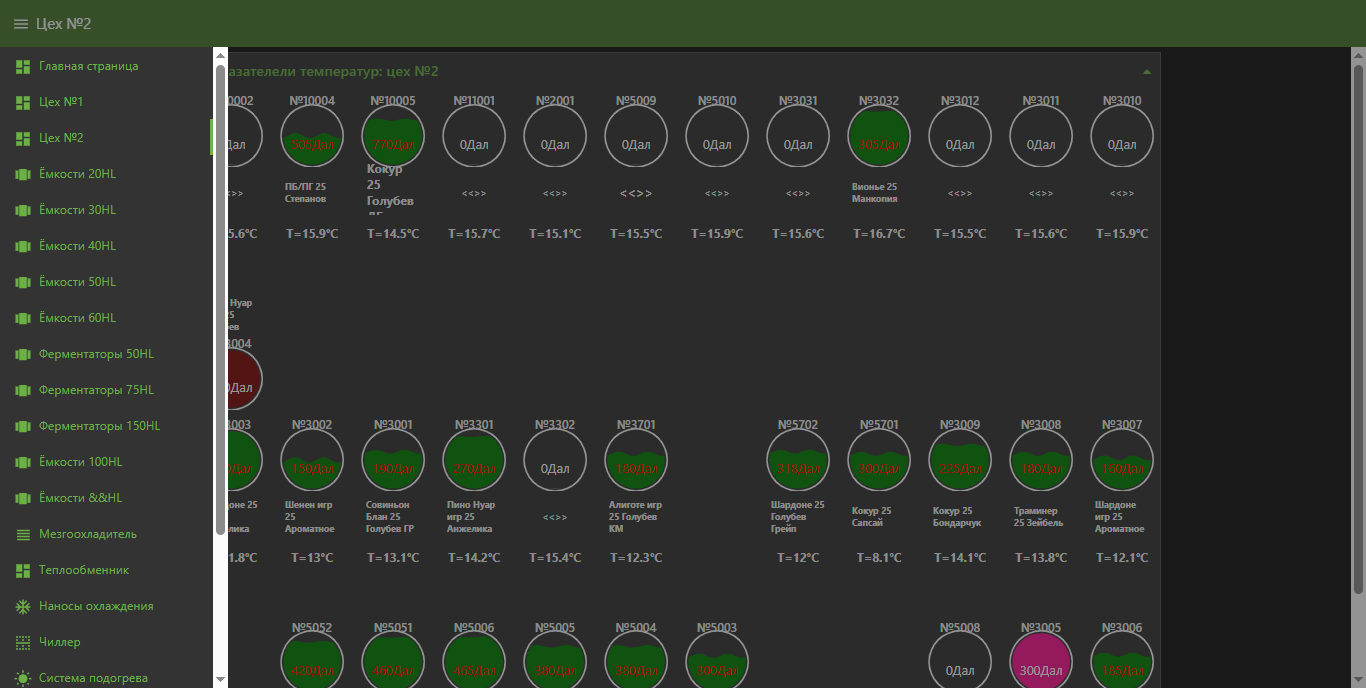Автоматизация технологических процессов виноделия позволят свести ряд операций управления оборудованием и контроля к снижению издержек, повышению качества продукции и увеличения скорости реакции на возникновение нештатных ситуаций. Общее количество подключенных к системе емкостей и винификаторов: 75 ед.