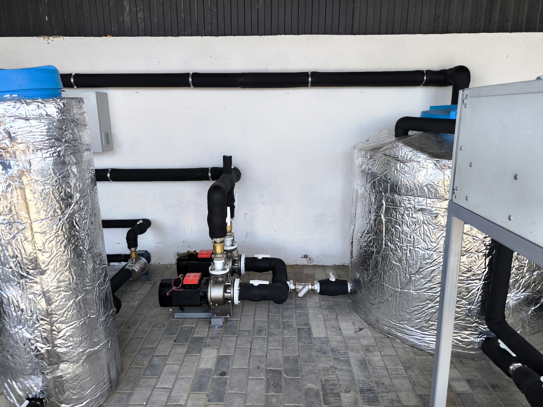 Автоматизированная насосная станция с частотным регулированием поддерживает стабильное давление в трубопроводе подачи. Кроме того часть из емкостей оборудована редукторами с целью дополнительной безопасности. Выполнена балансировка каждой ветки групп емкостей и винификаторов по расходу хладоносителя и давлению.